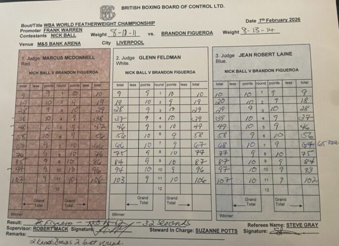 11回までの公式スコアはグレン・フェルドマン(米)104-103、マーカス・マクドネル(英)104-103でフィゲロアと、ジャン=ロベール・レーヌ(モナコ)107-102でボールとされていた。しかし、ボールの5ポイントリードはないだろう。